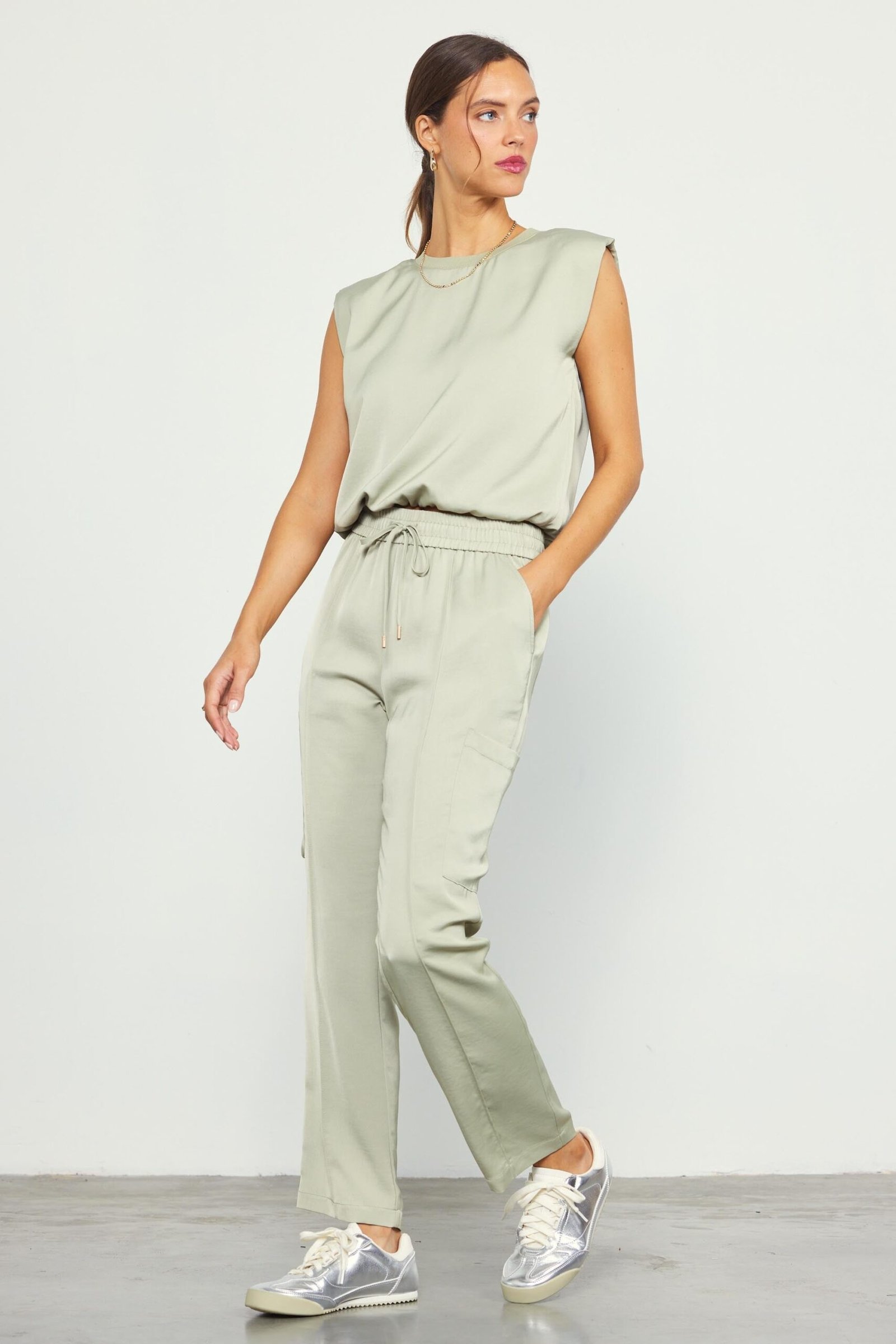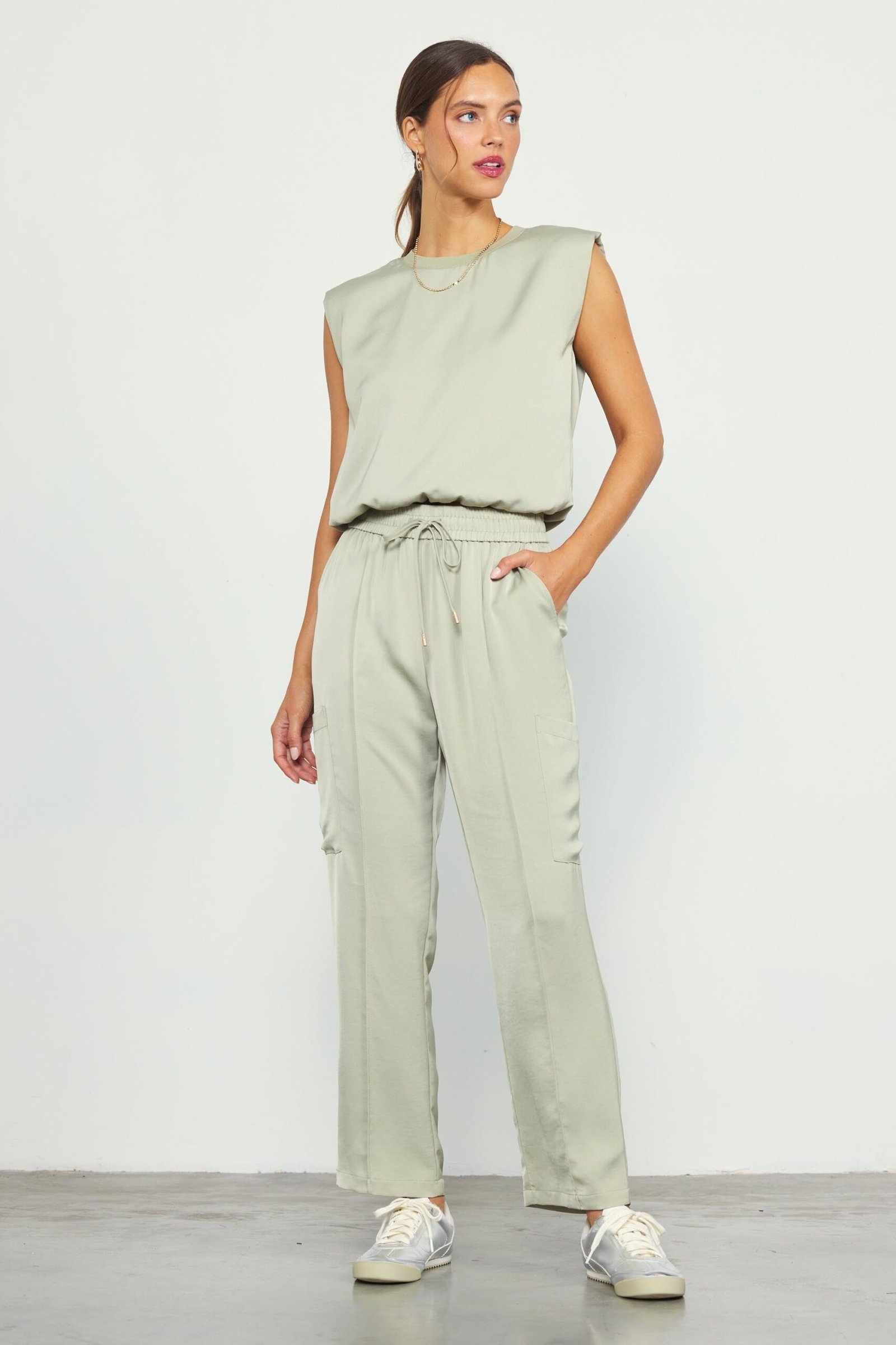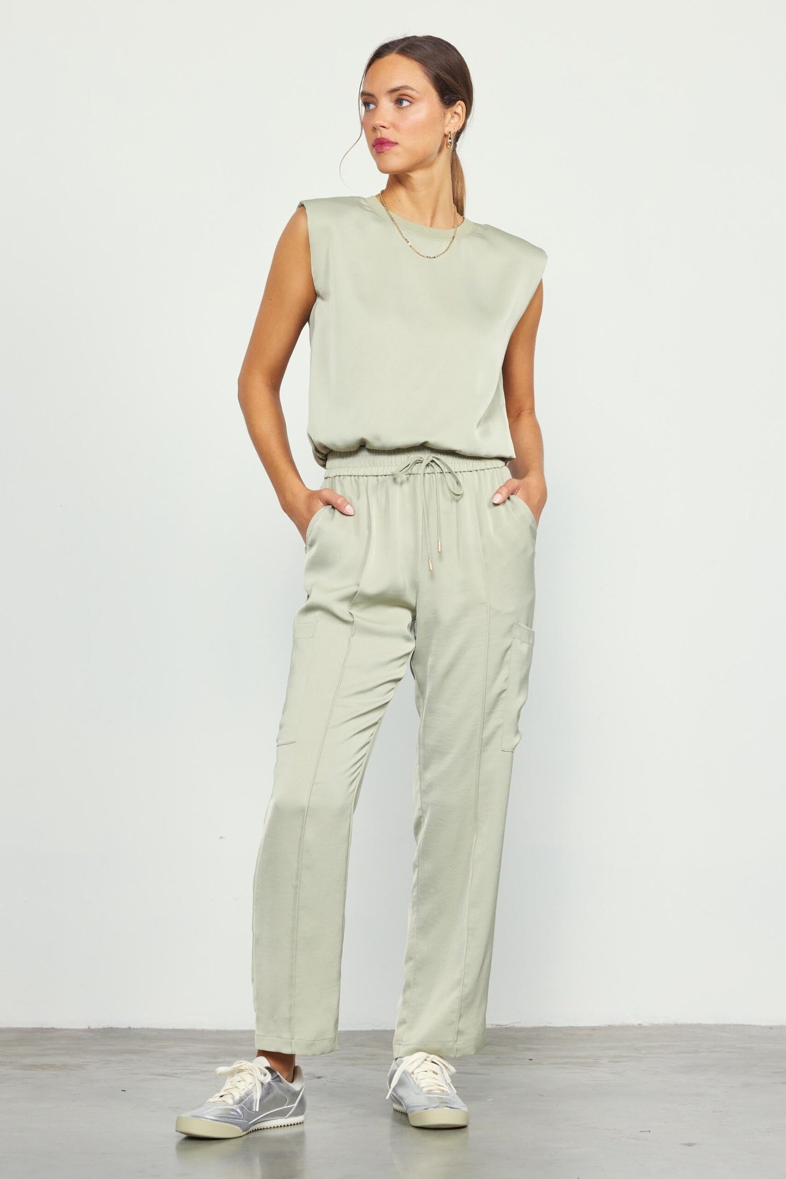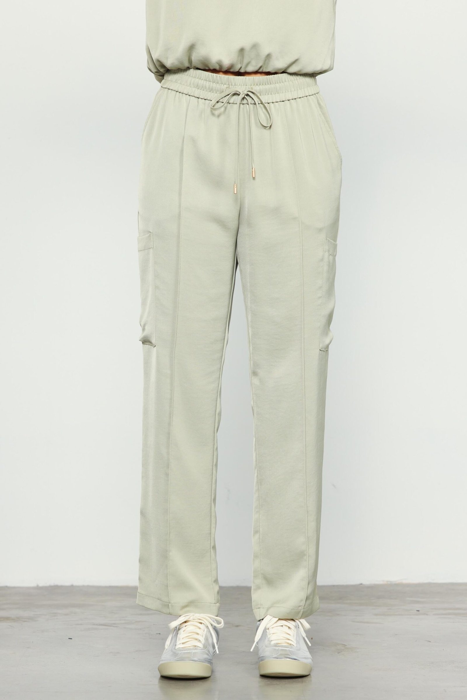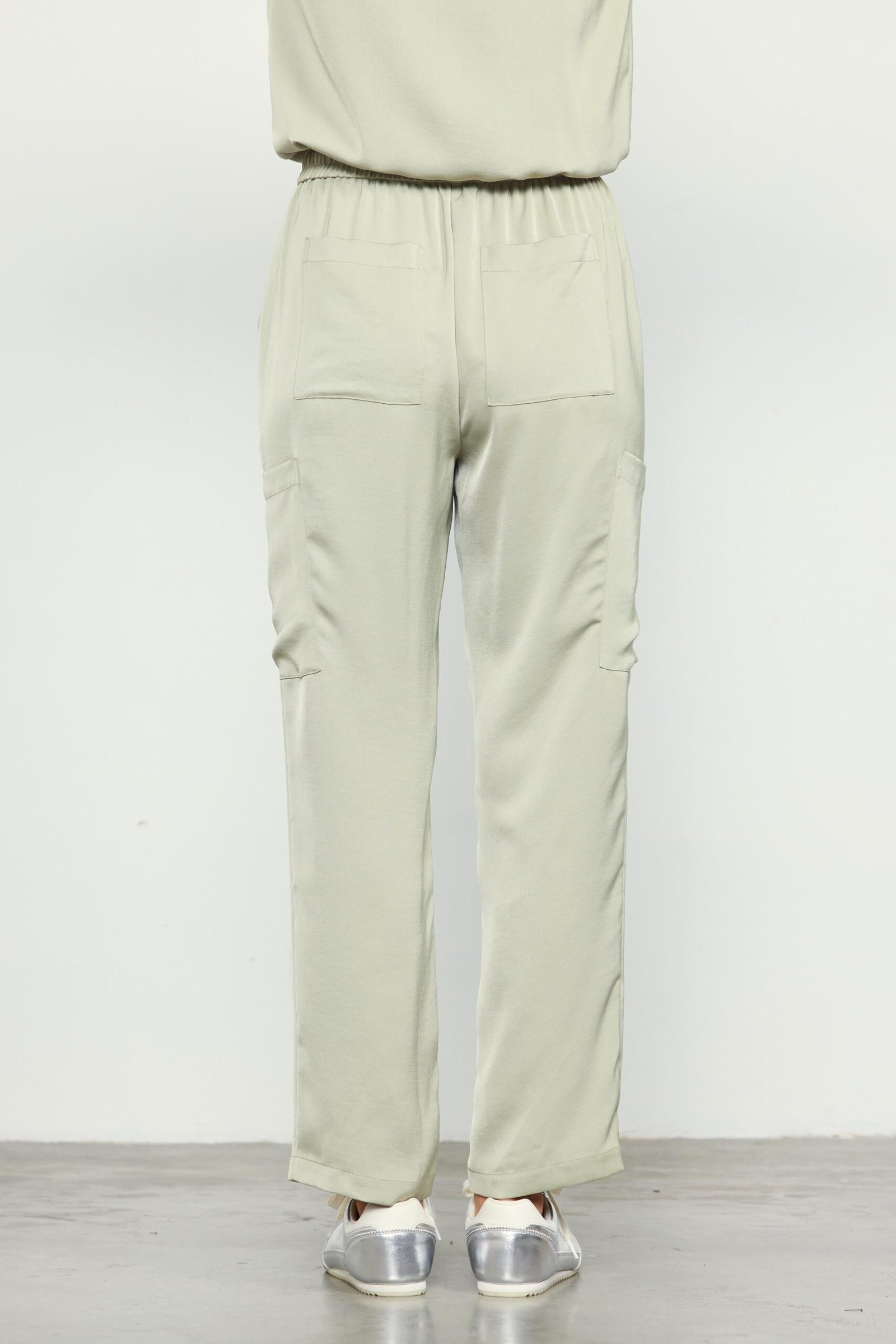Pintucked silky cargo style straight leg pant. Pockets and elastic waist.