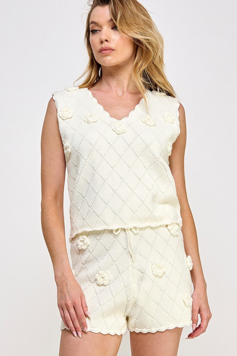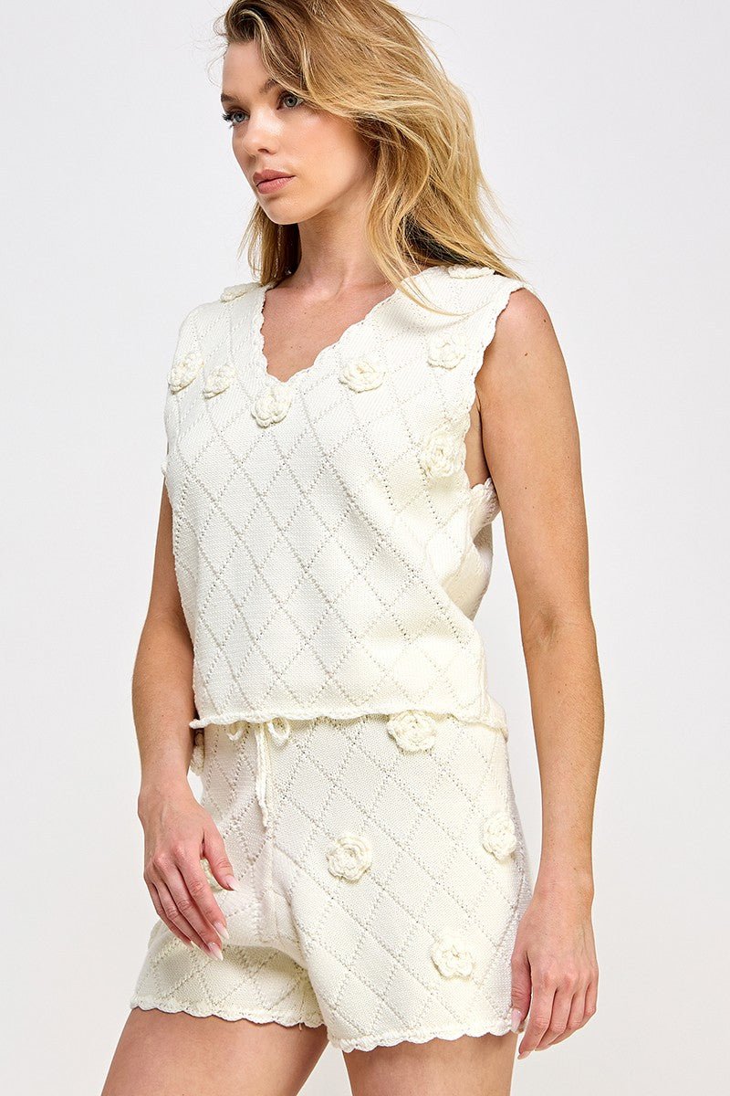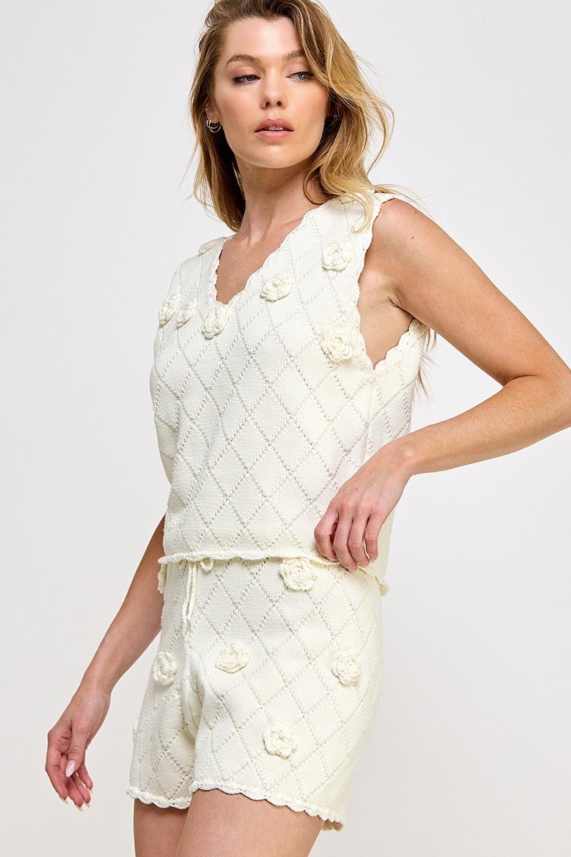 V-neck open knit design brings retro-inspired style to this cozy-chic sleeveless sweater vest 3D floral detailed, scalloped neckline sleeve line bottom lime diamond shape weave.