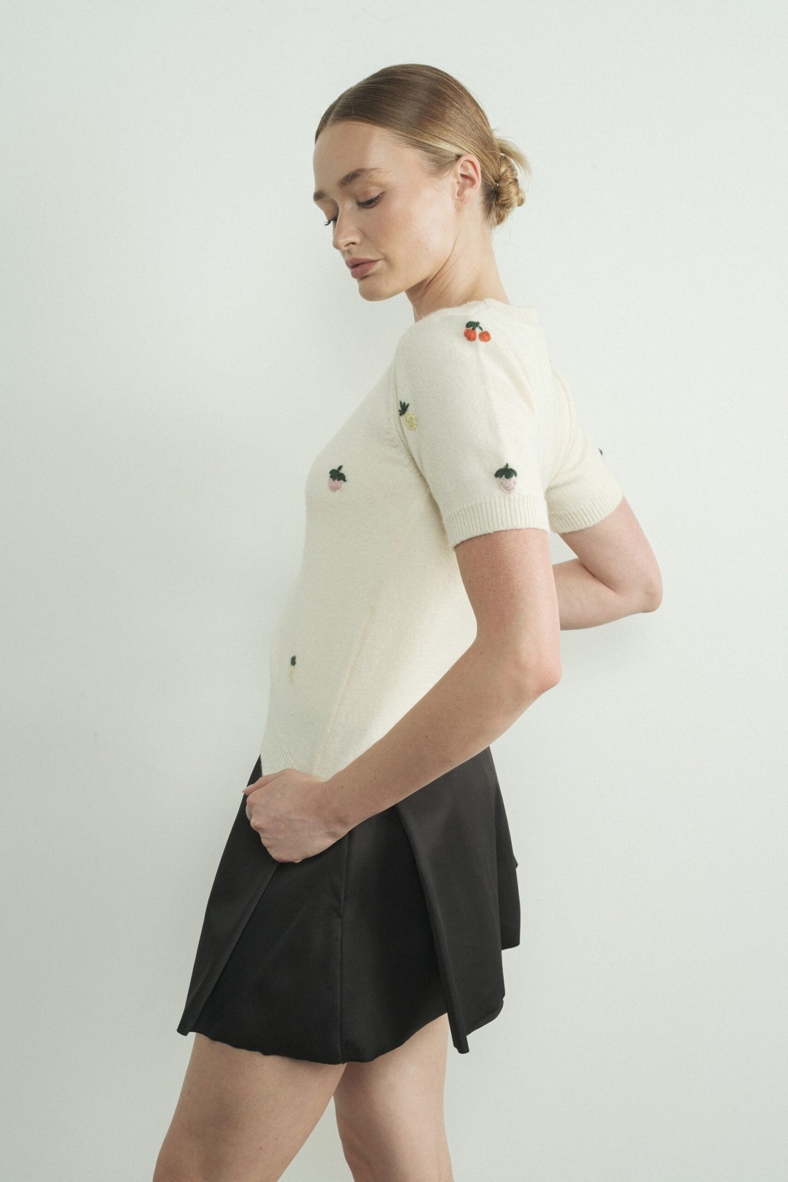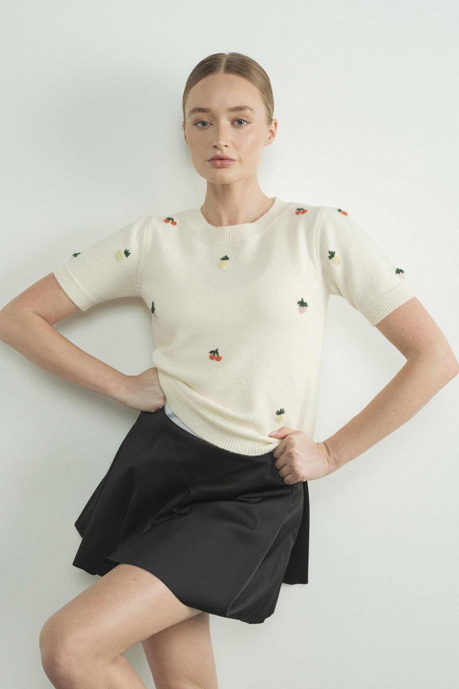 This charming cream knit sweater, this short sleeve sweater features a classic round neckline and a flattering fitted silhouette. Adorned with with adorable embroidered fruits in vibrant colors, the ribbed edges at the hem and sleeves ass a touch of texture.
