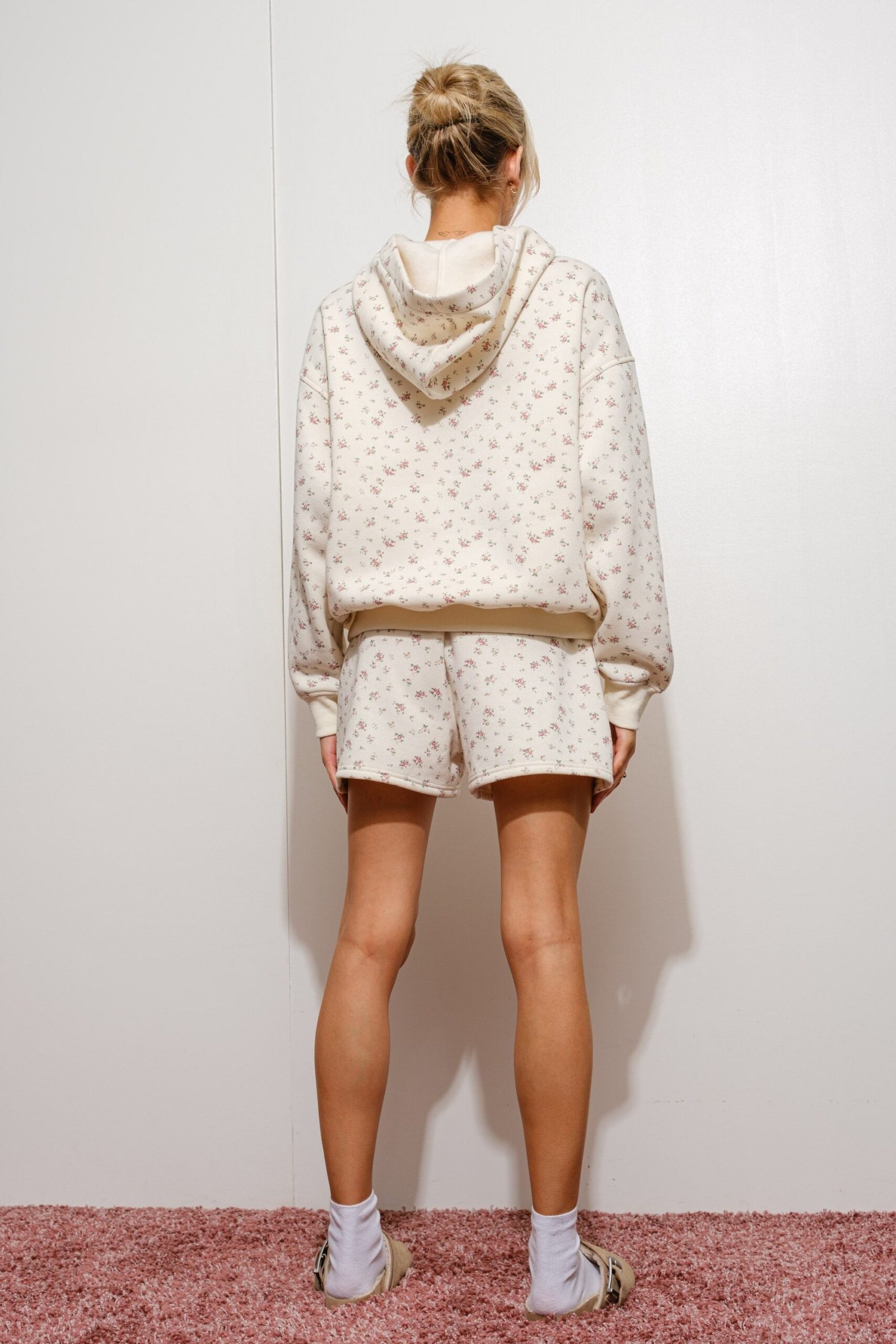 OMG, this set is so cute!! This hoodie features an oversize fit, hoodie and a front pocket. All-over ditsy floral print.