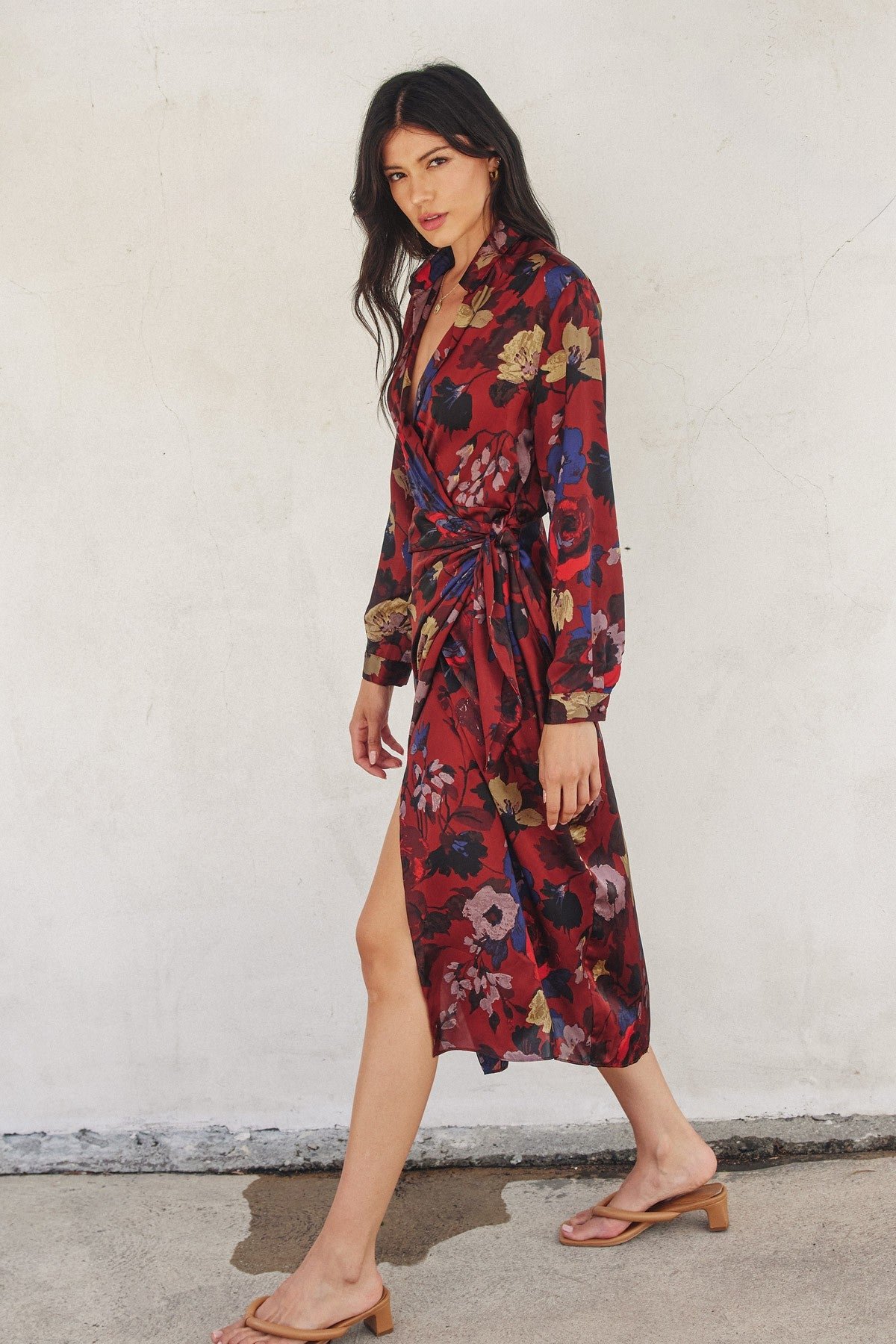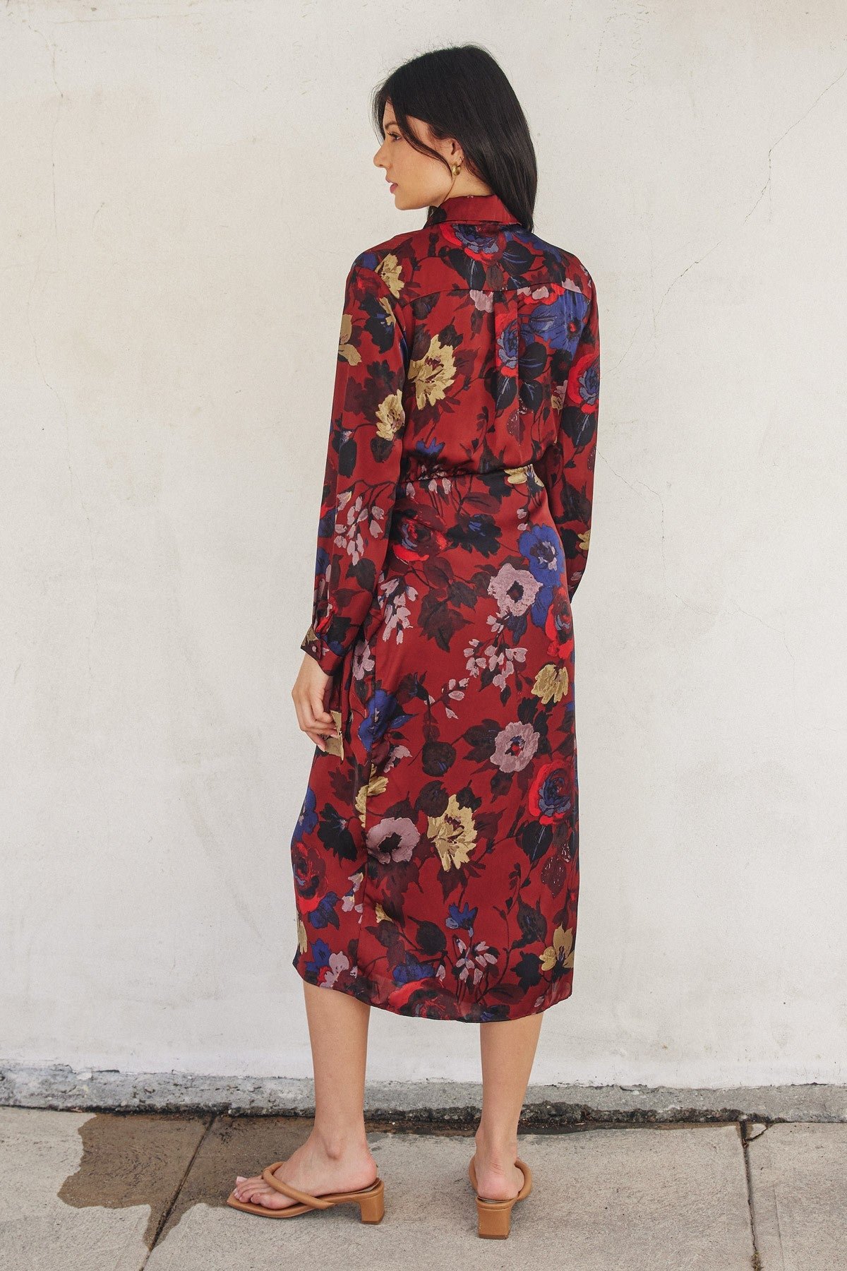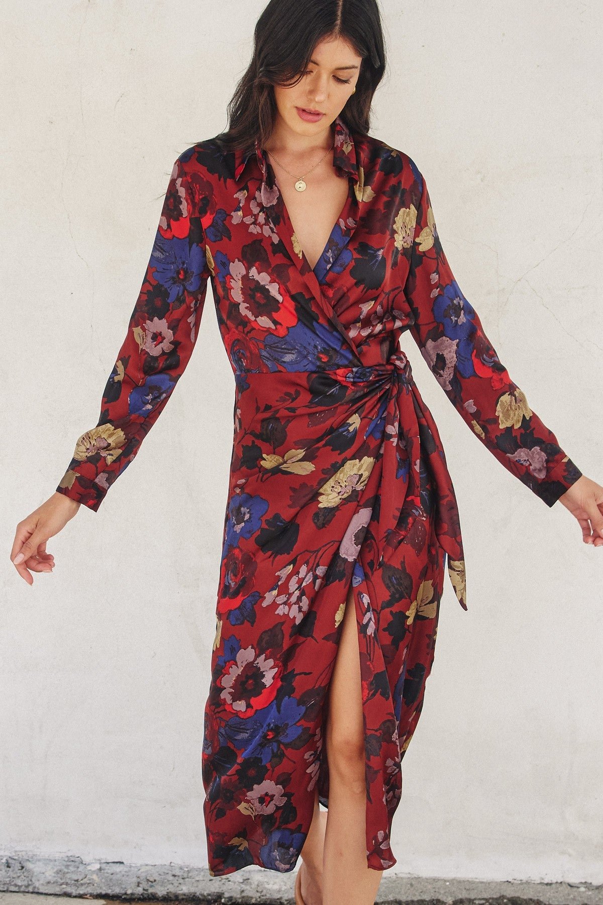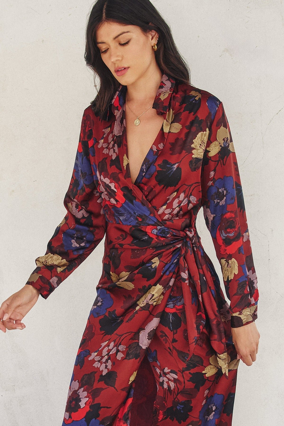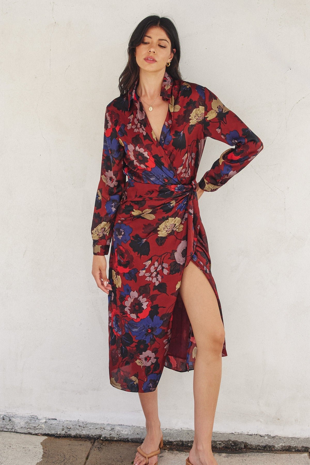 Floral printed shirt dress in a wrap design and tie closures. Shirt dress with a collar, buttoned cuff long sleeve.