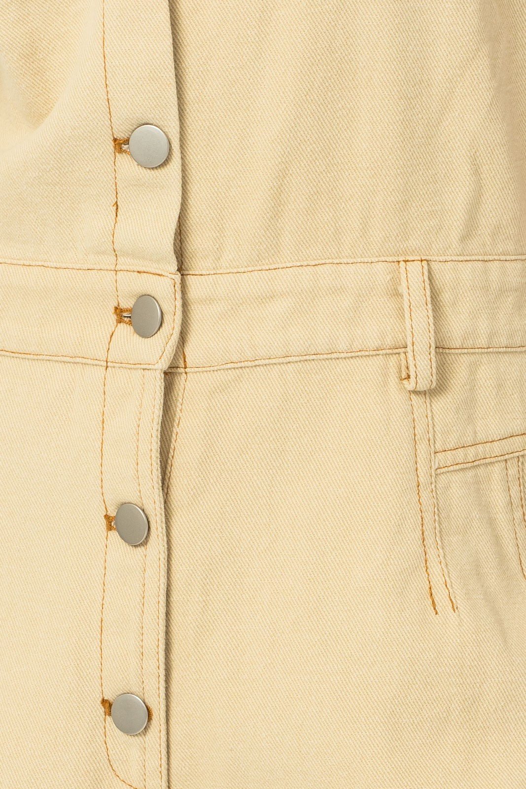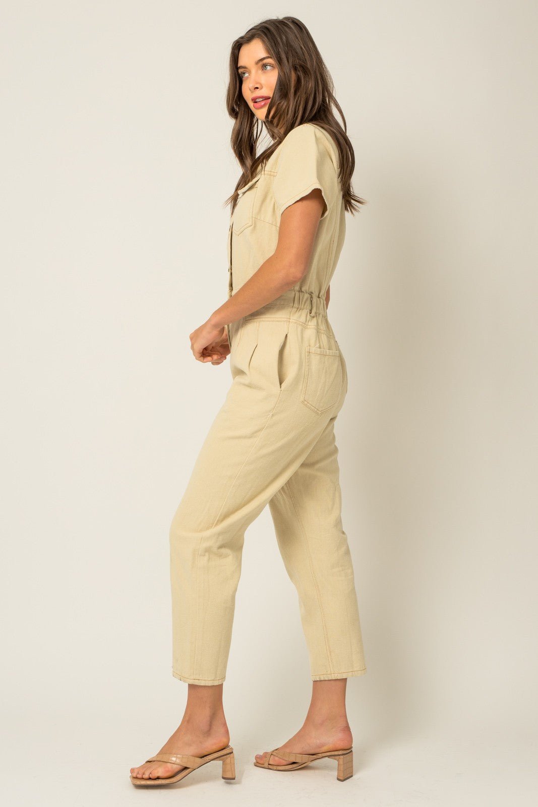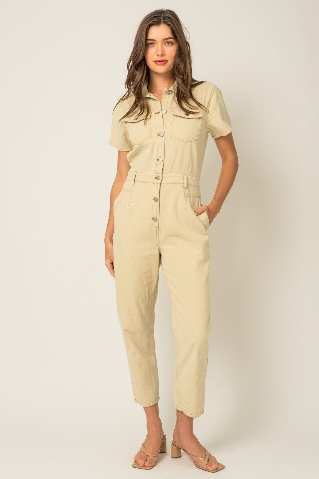 Short sleeve denim jumpsuit, front button with side pockets.