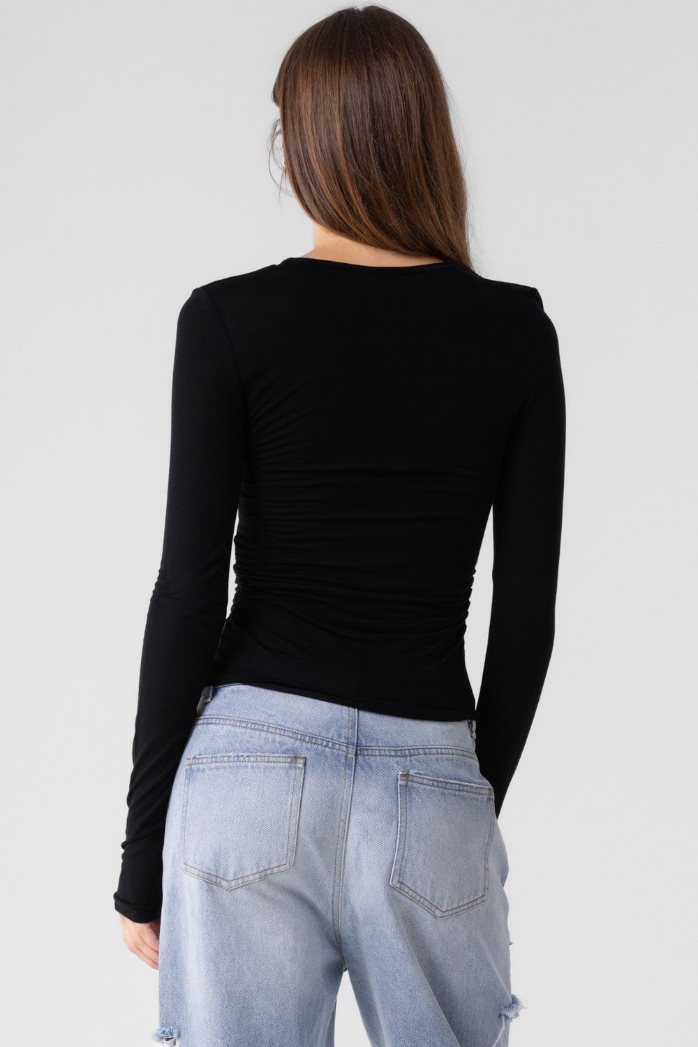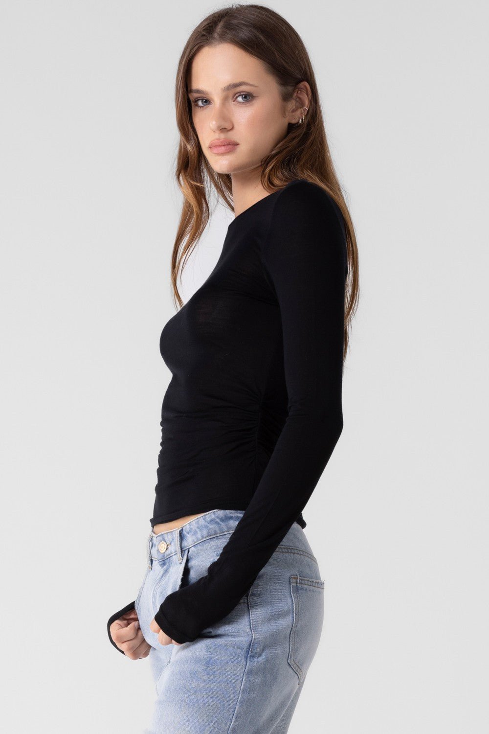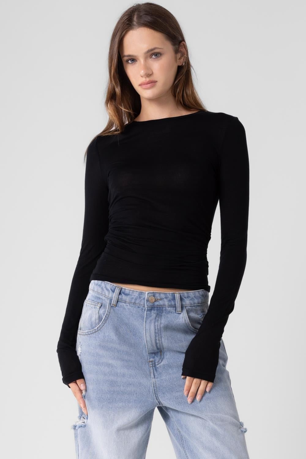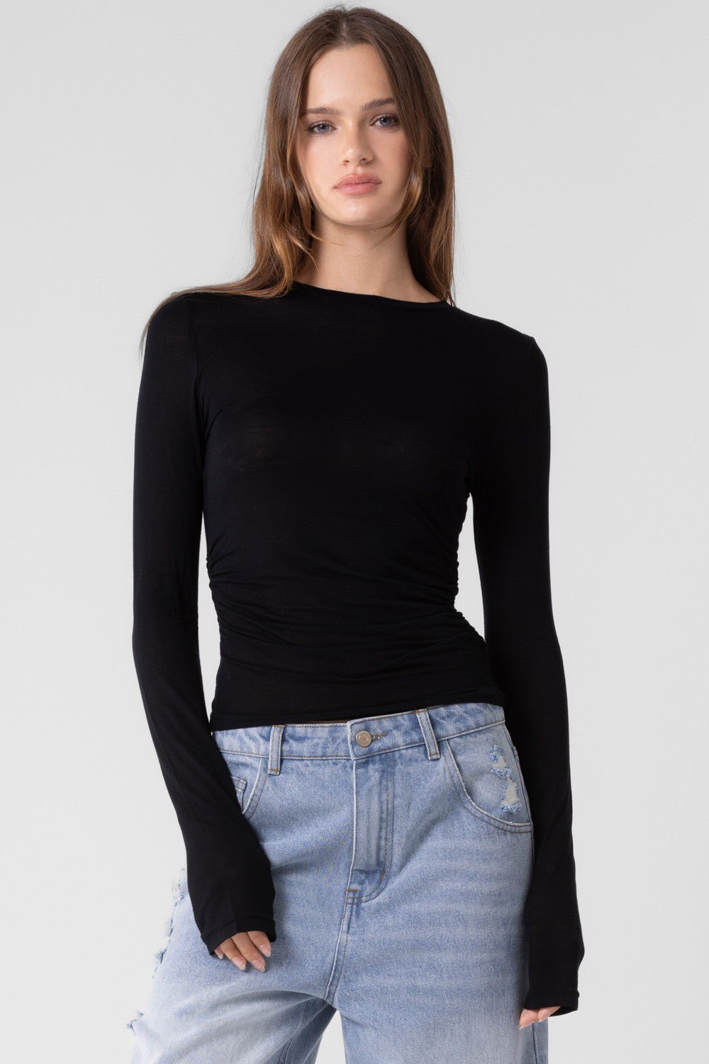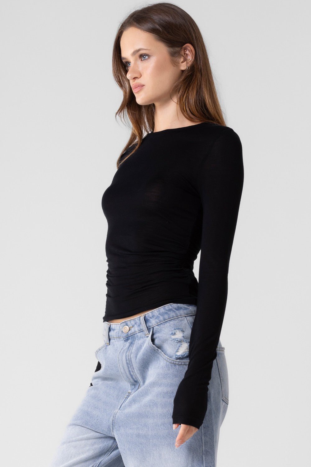 That basic sheer long sleeve perfect for under vest jackets or just to layer it! Ruching on the side!