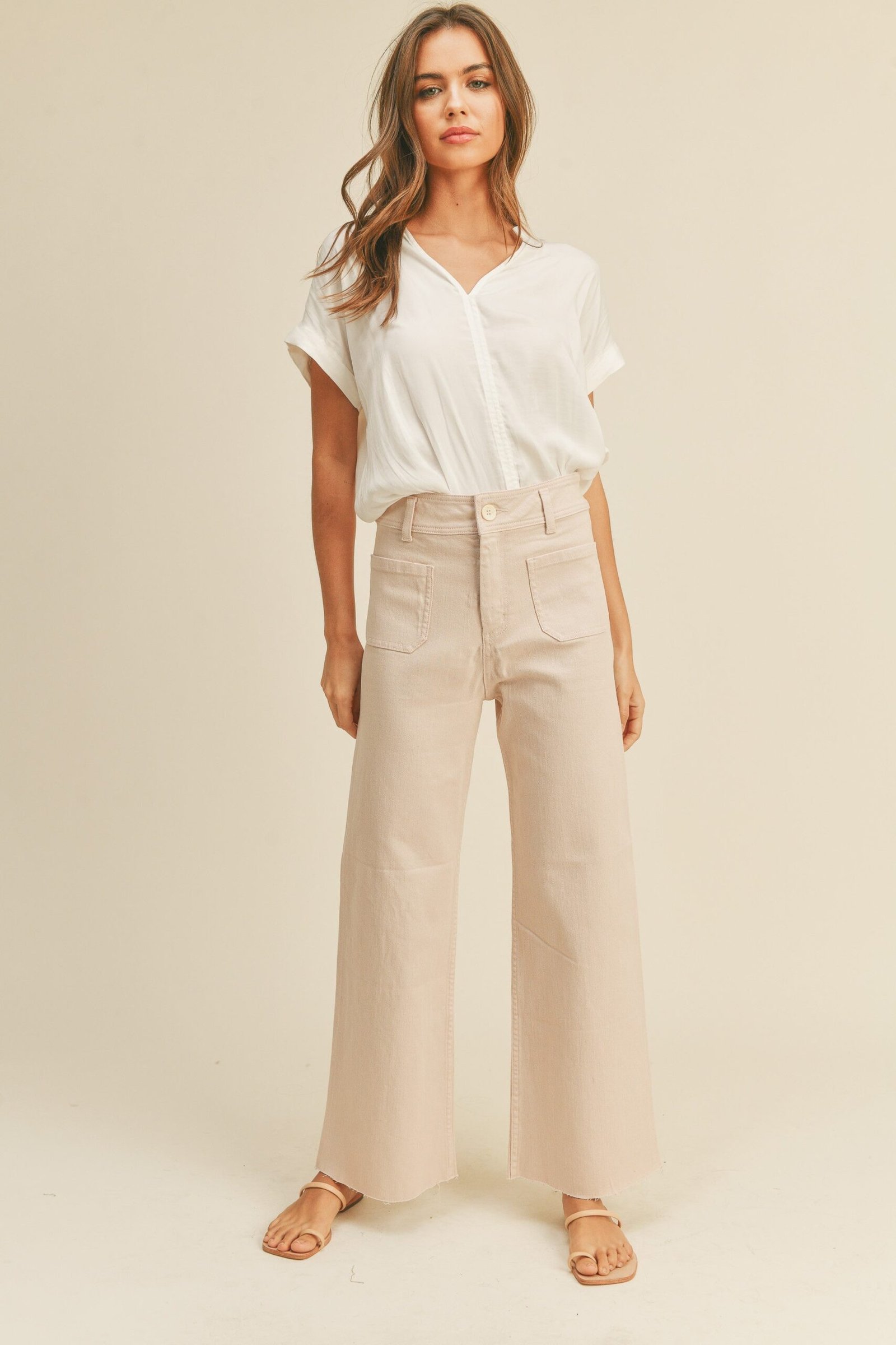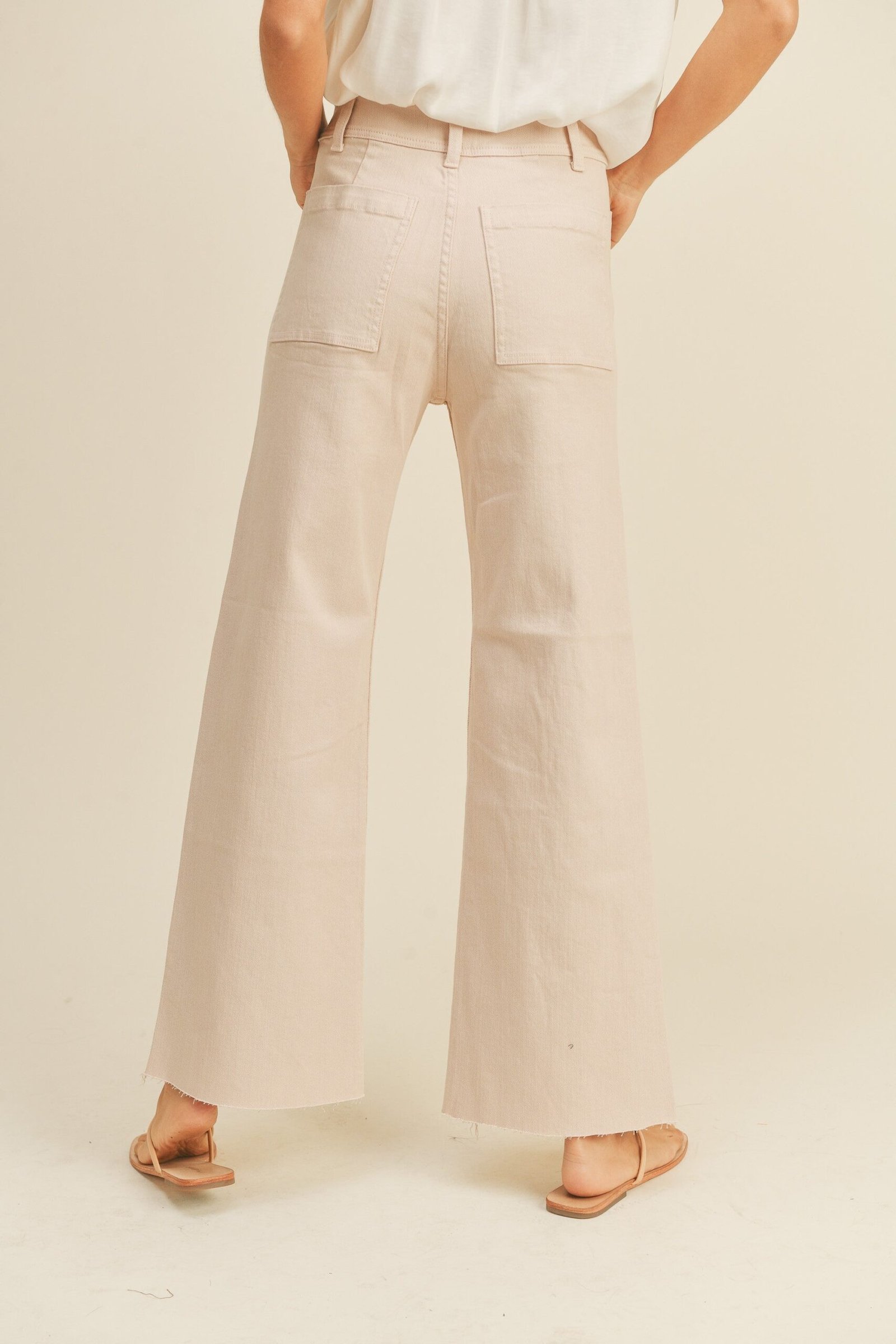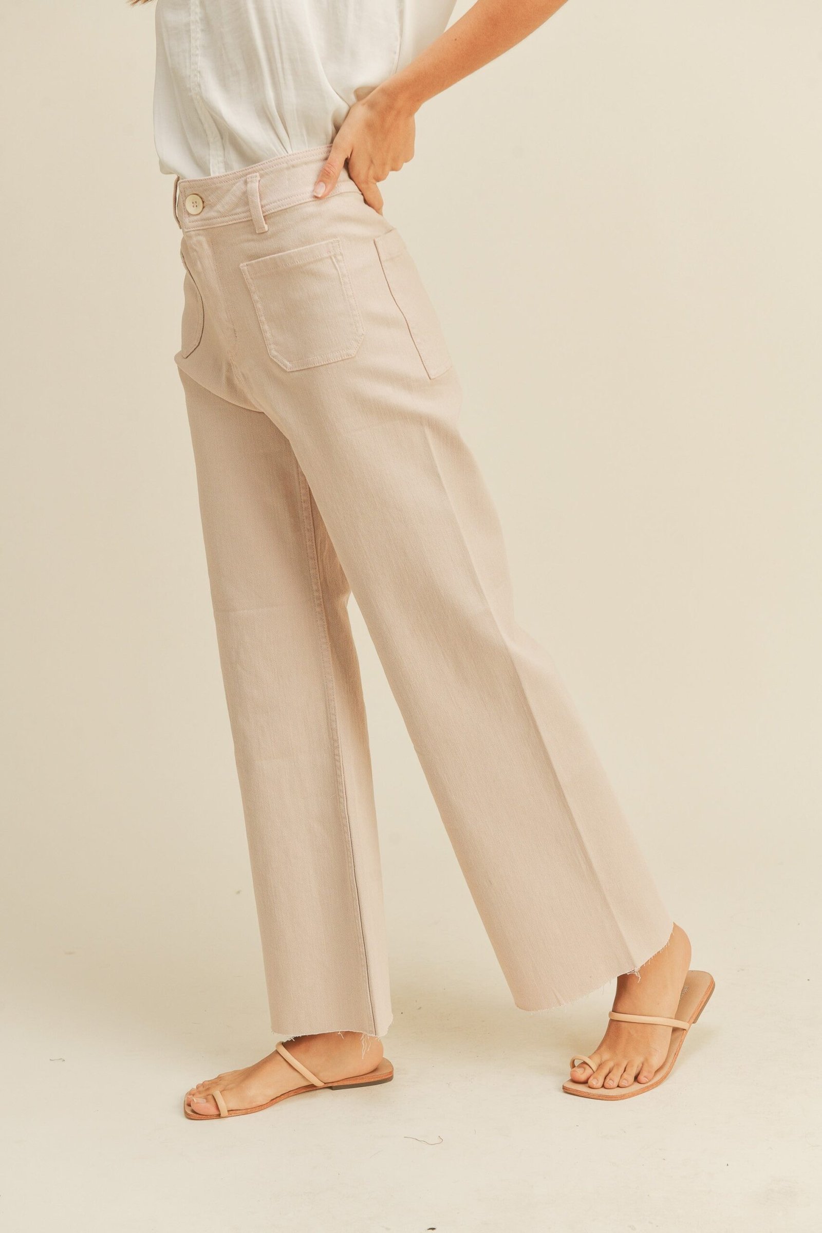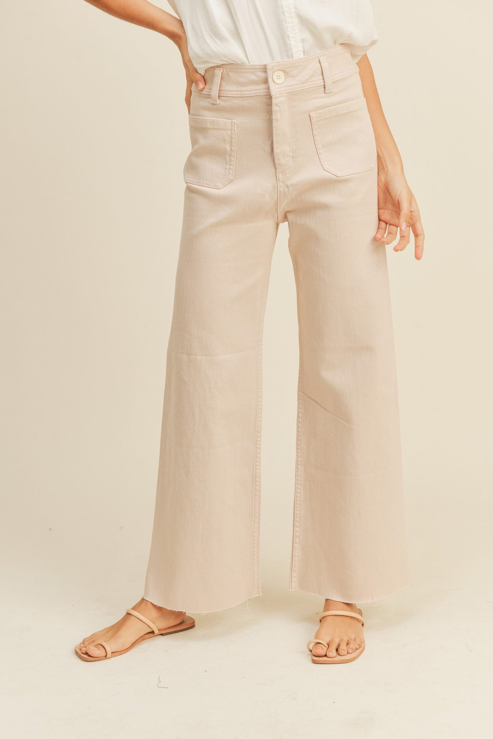 These light pink pants are super comfy with fun cute front and back pockets, style – wide leg.