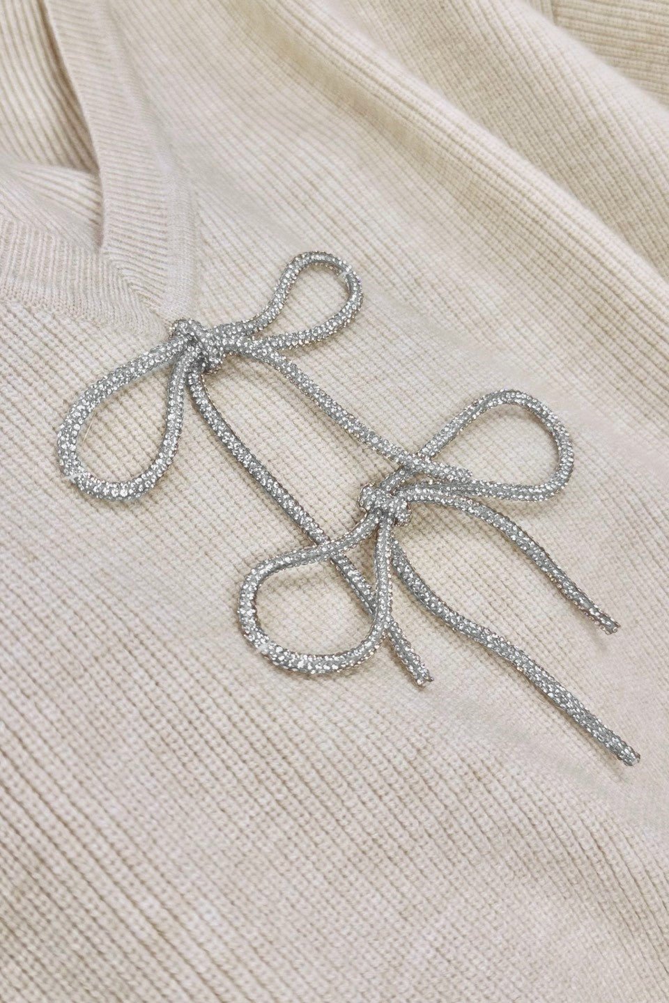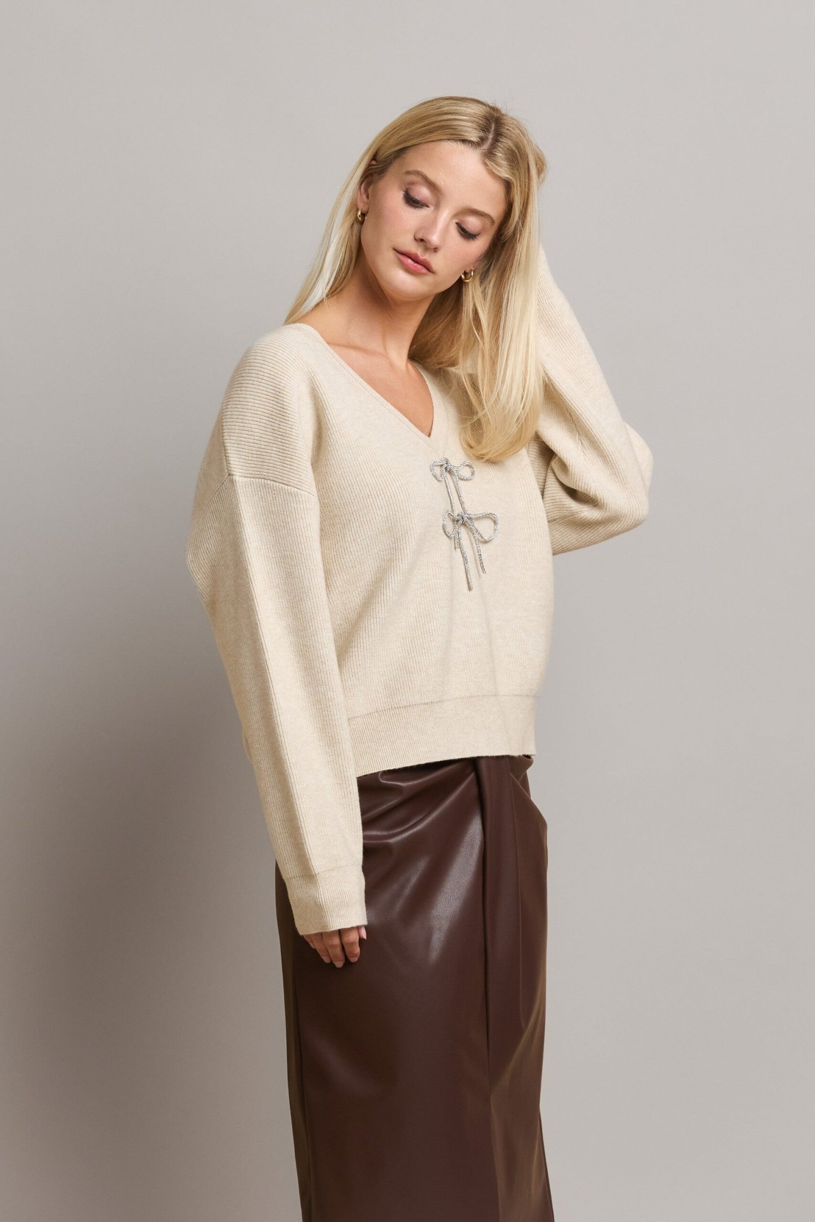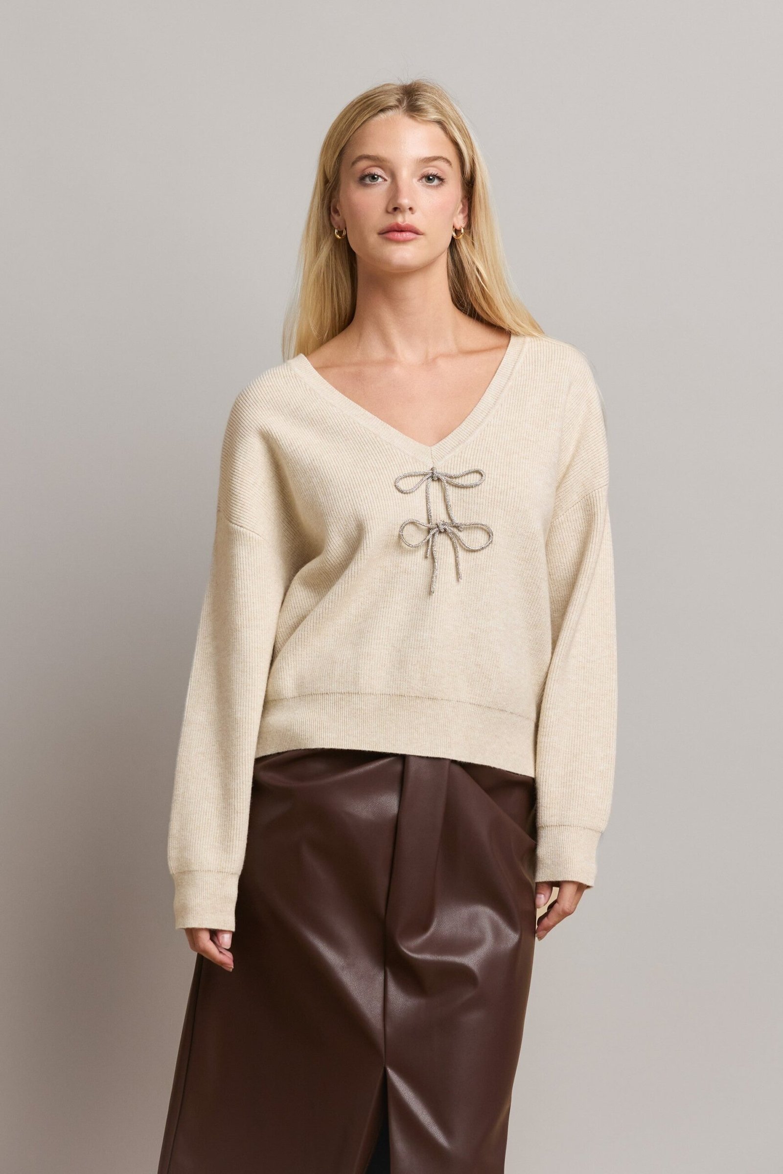 Holiday season is here, this sweater is everything and more… Long sleeve glitter front bow details and a v-neck making this sweater an outfit dressy!